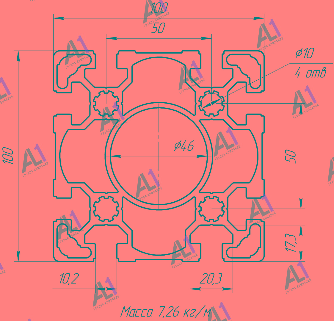 Конструкционный алюминиевый профиль 100х100 с размером паза 10 мм изготовлен из сплава AlMg0,7Si 6063 Т6, соответствует ГОСТ 22233–2018.