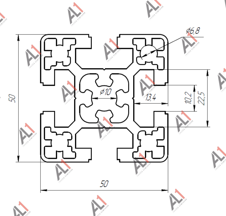 Конструкционный алюминиевый профиль 50х50 с размером паза 10 мм изготовлен из сплава AlMg0,7Si 6063 Т6, соответствует ГОСТ 22233–2018.